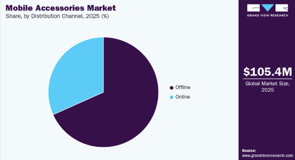 オフラインセグメントはモバイルアクセサリー市場を支配し、2025年には68.3%のシェアを占めました。スマートウォッチやモバイルカメラレンズといった高価なデバイスへの需要増加と、壊れやすい商品の配送に関する問題意識が、このセグメントの成長を推進しています。伝統的な購買方法と、地元小売店やその他の卸売市場における価格差が、このセグメント成長の理由です。