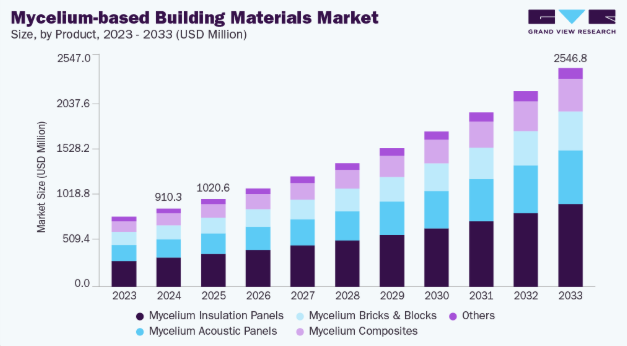菌糸体(菌類の根のような構造)は、再生可能で生分解性、かつカーボンネガティブなソリューションを提供し、コンクリート、プラスチック、断熱フォームなどの従来材料の魅力的な代替品となっています。農業廃棄物を用いて成長する能力は、その持続可能性をさらに高め、循環型経済の実践やグリーンビルディング認証に向けた世界的な動きと合致しています。