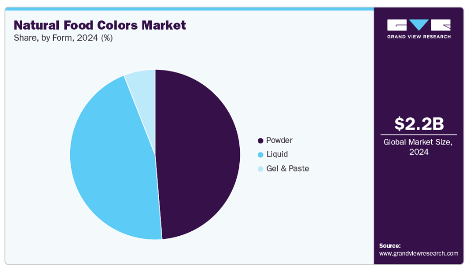 粉末状の天然食品着色料は市場で最大のシェアを占め、2024年には約48.7%の割合を占めました。粉末セグメントは、保管・取り扱い・適用精度における明確な優位性により、大きな収益シェアを獲得しています。粉末状の天然食品着色料は液体形態に比べて保存期間が長く、廃棄物削減と在庫管理の最適化を目指す製造業者に非常に適しています。さらに粉末は、輸送中のこぼれや劣化に強く、保管・輸送が容易です。これらの特性は、業務効率が重要な大規模食品生産環境において特に価値があります。