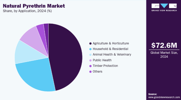 農業・園芸分野は2024年に46.7%の収益シェアを占め、用途セグメントを支配しました。これは環境に優しく残留性の低い殺虫剤の広範な採用が牽引しています。主要な作物害虫に対するピレトリンの有効性と有機農業基準への適合性が、生産者にとっての優先選択肢となっています。メーカーはピレトリンベースのソリューションを大規模農業用途に統合する動きを加速させており、安定した需要を確保するとともに、このセグメントの主導的地位を強化しています。