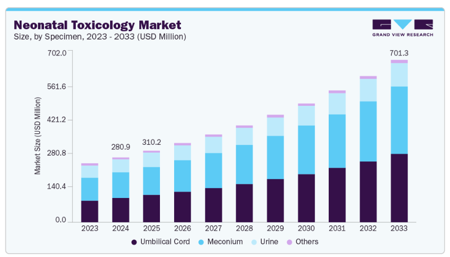 ベンゾジアゼピン系薬剤セグメントは、母体薬物曝露との関連性およびそれに伴う新生児検査・モニタリングの必要性から、予測期間中に著しい成長が見込まれます。不安、不眠、痙攣管理のために広く処方されるベンゾジアゼピン系薬剤は、胎盤関門を通過して新生児に影響を及ぼし、呼吸窮迫、離脱症状、神経発達障害などの合併症を引き起こす可能性があります。これにより、曝露を早期に特定し臨床管理を導くための専門的な新生児毒性検査の需要が高まっています。処方率の上昇に加え、誤用や依存への懸念が高まっていることも、正確なスクリーニング手法の重要性をさらに浮き彫りにしています。市場成長は、分析技術の進歩や、子宮内ベンゾジアゼピン曝露の長期的な影響に対する認識の高まりによっても支えられています。