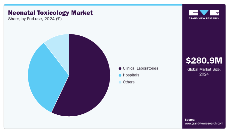臨床検査室セグメントは、2024年に57.07%という最大の市場シェアでエンドユースセグメントを支配しており、予測期間中は12.17%という最速のCAGRで成長すると予想されています。臨床検査室は、様々なサービスをワンストップで提供できることから、医療現場で好まれています。新生児向けの包括的な毒物学スクリーニングサービスを提供する最前線に位置しています。NMS Labsなどの検査機関は多様な検査サービスを提供しており、医療提供者、病院、新生児集中治療室(NICU)向けに、薬物、毒素、代謝物など様々な物質を検出する幅広い検査オプションを提供しています。