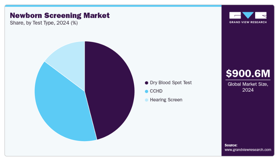 乾燥血液スポット(DBS)検査は新生児スクリーニング市場を牽引し、2024年には収益の46.01%以上を占めました。予測期間中、最も高いCAGRで成長すると見込まれています。DBS検査は新生児スクリーニングに関連する50以上の疾患の検出に用いられます。政府当局による取り組みの増加も、予測期間中のセグメント成長を加速させると見込まれています。例えば、2025年4月には、クアンテリックス社(アメリカ)が、オーストリア・ウィーンで開催された国際アルツハイマー病・パーキンソン病および関連神経疾患会議(AD/PD)において、産業をリードするSimoaアッセイキットの一部として、新たな乾燥血液スポット抽出(DBS)キットを発表しました。この新たな抽出キットにより、研究者はより費用対効果が高く侵襲性の低い手段で、乾燥血液スポットから低濃度のバイオマーカーを測定することが可能となります。