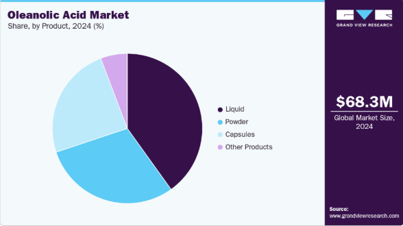 2024年には天然セグメントが売上高シェア54.34%で支配的だった。この成長は、実証済みの性能とクリーンラベルの訴求力により信頼が高まる植物由来活性成分が、医薬品・化粧品用途で優先的に選択されることに起因する。天然抽出プロセスが化合物の生物活性と治療的完全性を保持できる点がこの優位性を強化し、メーカーは規制基準と持続可能性基準の両方を満たす高性能で生体適合性の高い原料を提供可能となる。これにより天然由来オレアノール酸の継続的な選好と長期的な市場リーダーシップが確保される。