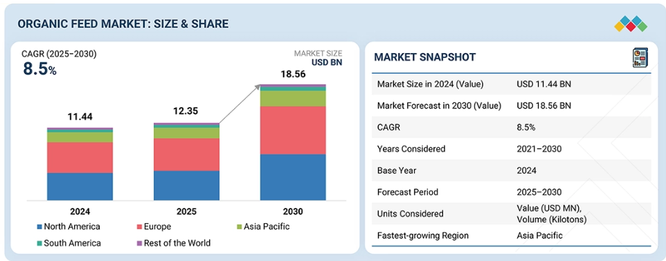 有機飼料市場は、2025年の123億5000万米ドルから2030年までに185億6000万米ドルに達すると予測されており、2025年から2030年にかけて年平均成長率(CAGR)8.5%で成長が見込まれます。