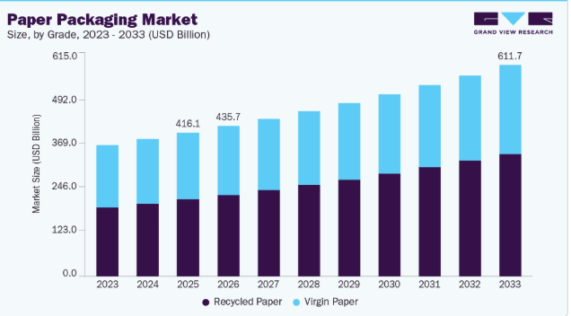 世界の紙包装市場規模は2025年に4,160億7,000万米ドルと推定され、2033年までに6,116億6,000万米ドルに達すると予測されています。