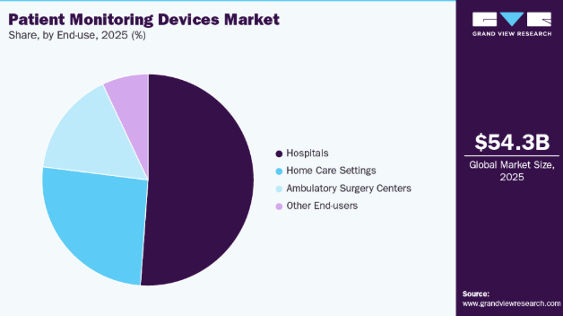 2025年時点で病院セグメントが最大の収益シェアを占めた。これは、病院における正確かつ迅速な疾患検出の必要性が高まっていることに加え、そこで実施される処置の数が増加しているためである。このセグメントの拡大は、外傷、慢性疾患、その他の状態による入院患者数の増加に牽引されている。一般病棟や集中治療室では、酸素飽和度、呼吸数、血圧、心拍数などのバイタルサインを継続的に追跡するために、多機能患者モニターが頻繁に使用される。