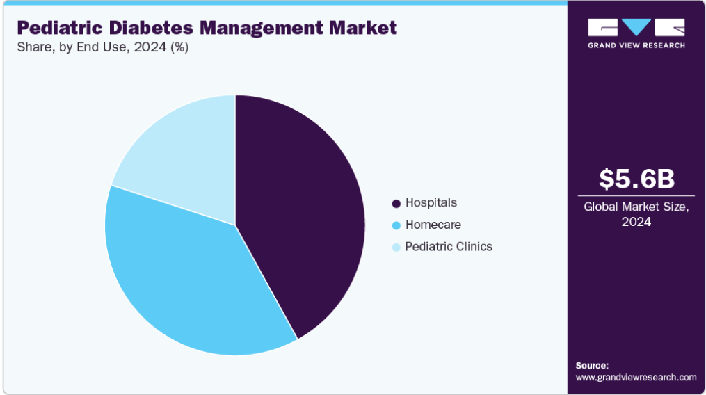 エンドユーザー別では、2024年に病院セグメントが42.0%と最大の収益シェアを占めた。病院は小児糖尿病の診断、初期治療、継続的管理における主要なアクセスポイントとして機能し、内分泌科診察、糖尿病教育、持続血糖モニタリング(CGM)やインスリンポンプなどの先進技術へのアクセスを含む包括的なサービスを提供している。さらに、病院は糖尿病性ケトアシドーシス(DKA)のような急性合併症の管理において極めて重要であり、これは糖尿病児に多く見られる生命を脅かす状態である。病院内に専門医療スタッフ、診断機器、救急医療体制が集中していることが、その市場での地位をさらに強化している。