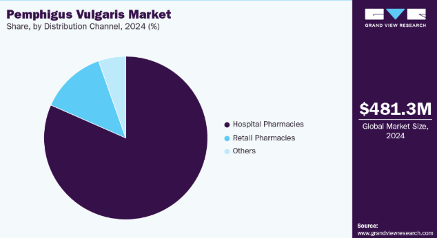 2024年時点で病院薬局セグメントが81.6%の最大市場収益シェアを占めた。PVは稀で重篤な自己免疫疾患であり、専門的なケア、静脈内投与や点滴療法、皮膚科医・免疫学者による綿密なモニタリングを必要とするため、病院薬局が最大のセグメントとなっている。中等度から重度のPV患者は、リツキシマブ、全身性コルチコステロイド、静脈内免疫グロブリン(IVIG)などの治療を頻繁に病院で投与する必要があり、これらは小売薬局や在宅ケアでは効果的に管理できません。病院薬局内には訓練を受けた医療専門家、点滴施設、支援サービスが整っており、安全かつ効果的な治療提供を保証することで、患者のアクセスと服薬遵守率を高めています。