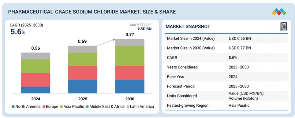 医薬品グレードの塩化ナトリウム市場は、2025年の5億9,000万米ドルから2030年までに7億7,000万米ドルに達すると予測されており、2025年から2030年にかけて年平均成長率(CAGR)5.6%で成長が見込まれます。