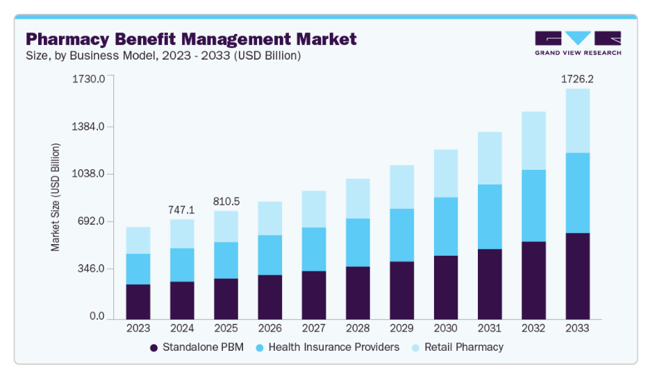 さらに、2032年までにメディケア・パートDが米国医薬品支出の36%を占めると予測されることや、2025年より1,870万人の受益者を対象に自己負担額を2,000米ドルに制限するインフレ抑制法などの政策変更は、公的医療保険の適用範囲拡大とマネージドケアソリューションへの依存度増加を通じて、PBM市場を強力に牽引しています。処方薬支出のより大きな割合がメディケアに移行するにつれ、監督・コスト管理・臨床管理を必要とする請求件数、受益者数、給付プログラムの量も相応に増加しています。