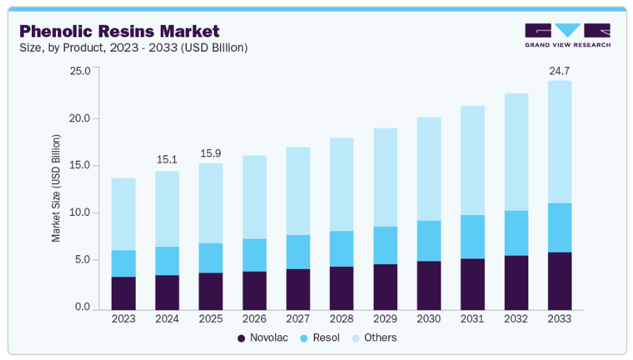 本レポートでは、2025年から2033年にかけてのグローバル、地域、国レベルでの収益成長を予測し、各サブセグメントにおける最新の業界動向を分析しております。本調査において、Grand View Researchはフェノール樹脂市場レポートを製品、用途、地域に基づいてセグメント化いたしました:
