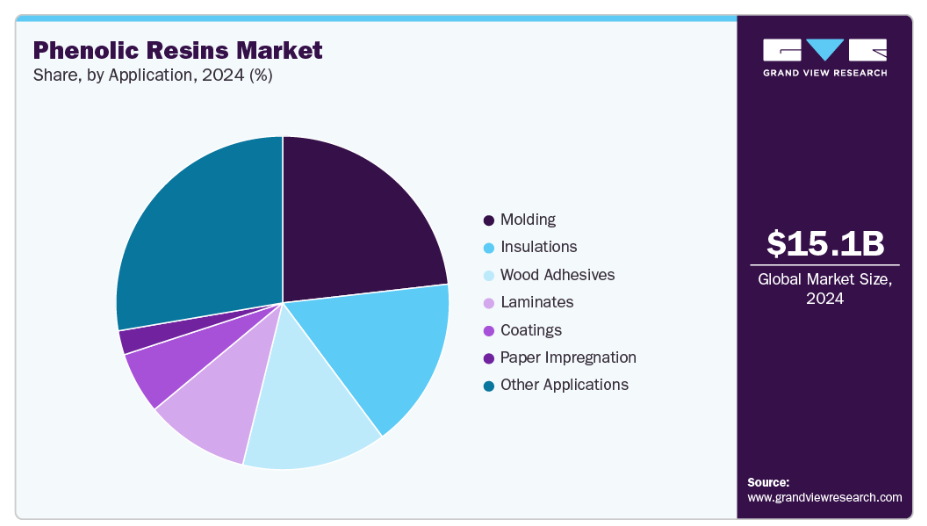 2024年、ノボラック樹脂セグメントはフェノール樹脂市場において売上高ベースで25.12%のシェアを占め、市場をリードしました。フェノール樹脂の一種であるノボラック樹脂は、優れた耐衝撃性、高強度、耐火性、耐熱性、耐薬品性、熱安定性、柔軟性、表面硬度、電気絶縁性、軽量性を備えており、サスペンション、シート、ボトムプレート、タイヤ、ブレーキピストン、ブレーキブロック&パッド、ブレーキライニング、クラッチフェーシングなどの自動車部品の製造に最適です。
