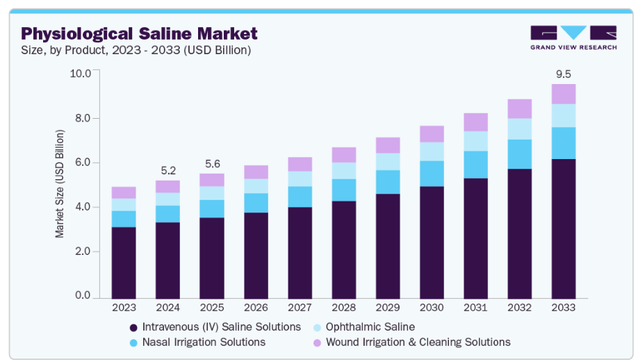 2025年から2033年にかけての年間平均成長率(CAGR)は6.97%と予測されております。この業界の成長は、外科手術件数の増加、透析を必要とする腎臓疾患などの慢性疾患の蔓延、そして水分補給や薬剤投与のための静脈内輸液における生理食塩水の広範な使用に起因しています。