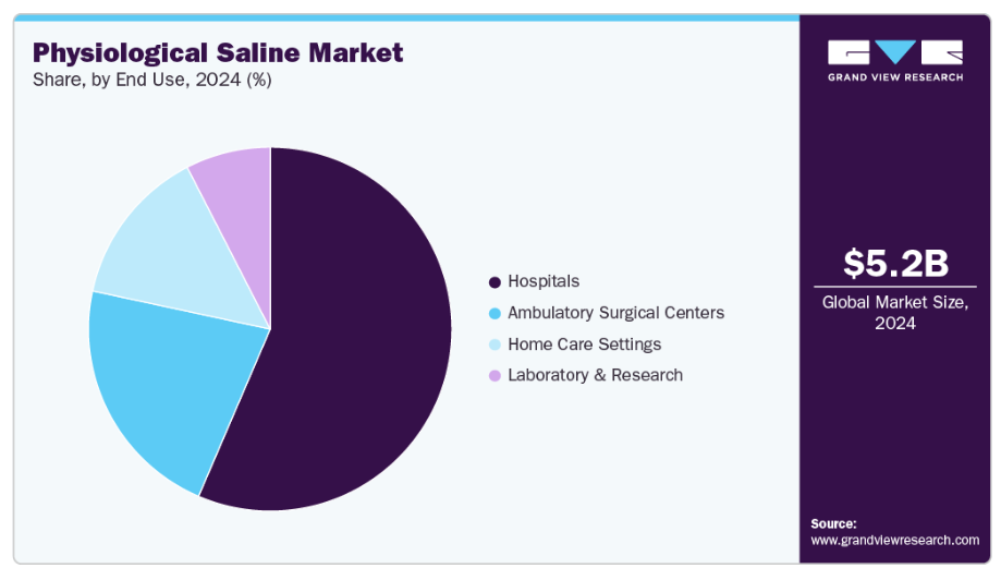 • 製品別では、静脈内(IV)生理食塩水セグメントが2024年に64.54%という最大の収益シェアで市場をリードしました。