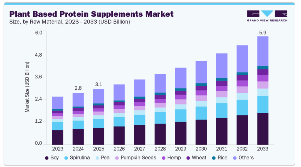 より多くの人々がヴィーガン、ベジタリアン、フレクシタリアンといった食生活を採用するにつれ、動物性タンパク質に代わる代替品の需要が加速しています。健康意識の高まりも中心的な要因であり、乳糖不耐症、アレルギー、消化器系の不快感から乳製品を避ける消費者が増加し、代わりに大豆、エンドウ豆、米、ヘンプのタンパク質サプリメントに目を向けています。特にミレニアル世代やZ世代といった若年層が、植物性パウダーやバー、即飲タイプをフィットネス、体重管理、日常の健康習慣に取り入れることで、この流れを牽引しています。彼らにとって、クリーンな栄養、天然由来、持続可能性は譲れない条件であり、植物性タンパク質が好まれる選択肢となっています。