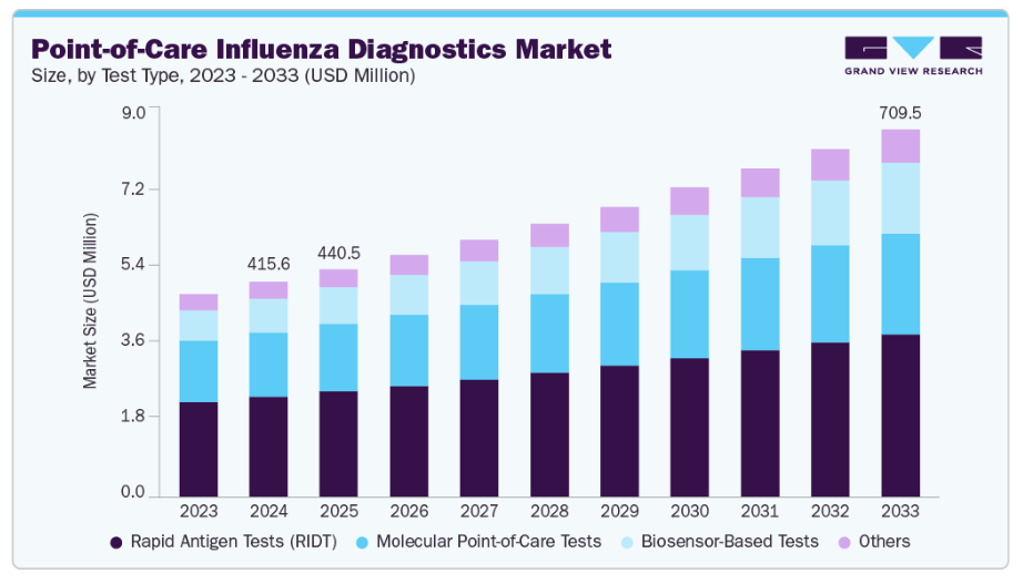 近年、FDAが承認した多重検査、AI対応、在宅検査キットは、インフルエンザ診断を迅速化・簡素化し、結果が数分で得られるケースも増えています。検査能力の向上、パンデミック対策、アウトブレイク監視を目的とした政府プログラムは、信頼性の高い診断ツールの普及を促進し、市場成長を後押ししています。さらに、COVID-19後の医療インフラ整備と、呼吸器感染症に対する国民の意識向上により、全国規模での迅速なポイントオブケア(PoC)インフルエンザ検査の価値が高まり、予測期間中に著しい市場成長が見込まれます。