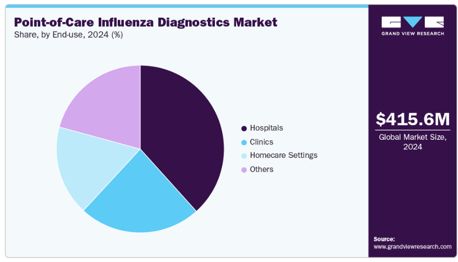 2024年には分子診断型ポイントオブケア検査が第2位のシェアを占めました。これは分子検査が従来型の迅速抗原検査よりも高い感度と特異度を有し、インフルエンザウイルスのより正確かつ迅速な検出を可能とするためです。季節的な流行を抑制するための迅速な診断への重視が高まる中、高度な分子診断型POCTの需要が増加しています。さらに、技術進歩により、携帯可能で操作が容易な分子診断装置が開発され、1分以内に検査室品質の結果を出力できるため、診療所、救急部門、さらには家庭での使用にも適しています。