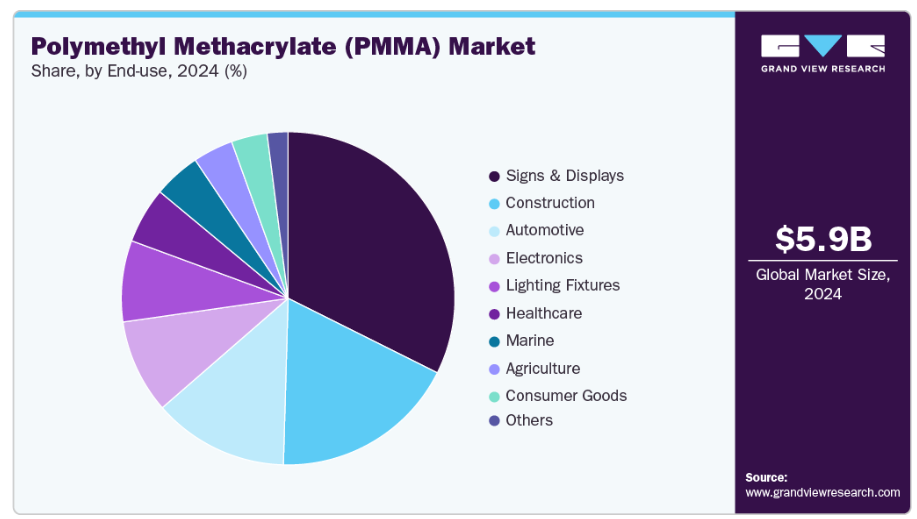 2024年には看板・ディスプレイセグメントが市場をリードし、32.0%という最大の収益シェアを占めました。これは広告パネル、照明付き看板、販売時点情報管理(POS)ディスプレイ、小売ブランディング用途におけるPMMAシートの広範な使用に起因しております。PMMAの優れた光拡散性、耐候性、表面光沢は、屋内・屋外を問わずディスプレイソリューションに理想的な素材です。小売・広告分野の急速な拡大と、視覚的に魅力的で耐久性のある販促資材への需要増加が相まって、ポリメチルメタクリレート(PMMA)産業における本セグメントの優位性をさらに強化しています。