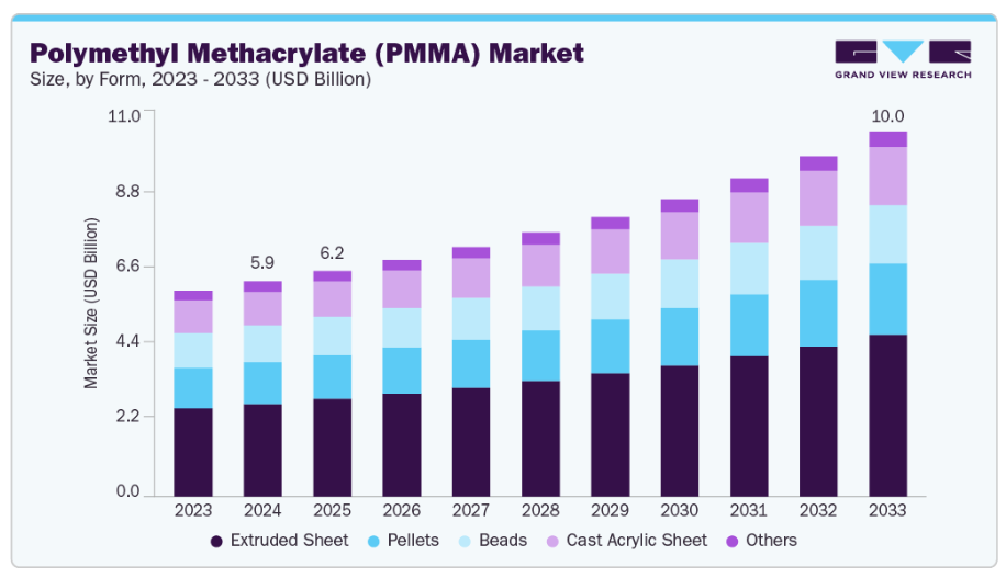 【英語タイトル】Polymethyl Methacrylate (PMMA) Market Size, Share & Trends Analysis Report By Form (Extruded Sheet, Cast Acrylic Sheet, Pellets, Beads), By Grade, By End-use, By Region, And Segment Forecasts, 2025 - 2033
