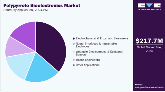 純粋ポリピロール(PPy)は製品セグメント全体で収益ベースの市場を支配し、2024年には46.57%の市場シェアを占めた。純粋ポリピロールはバイオエレクトロニクスで使用されるポリマーの基本形態であり、固有の導電性、合成の容易さ、生物学的システムとの適合性で知られる。機械的柔軟性よりも電気応答性と化学的安定性が優先される基礎研究や低コストバイオセンサー用途で広く採用されている。