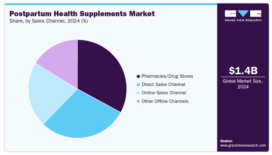 2024年時点で、薬局/ドラッグストアセグメントが32.93%の最大市場シェアを占めました。これらの店舗では通常、あらゆる種類の産後サプリメントを取り扱っており、特定の企業やカテゴリーの製品に限定されません。これにより、購入者は様々な製品から選択し、価格を比較することが可能です。さらに、地域の薬局はアクセスしやすさや豊富な品揃えといった利点があり、消費者に支持されています。このように、多くの製品が容易に入手可能なため、薬局は産後健康サプリメントの販売により相当な収益を生み出すと推定されます。加えて、ウォルグリーンズ、CVSファーマシー、ライトエイドなどの多数の薬局・ドラッグストアチェーンが店舗を通じて産後サプリメントを提供しており、予測期間中のセグメント成長を牽引すると見込まれます。