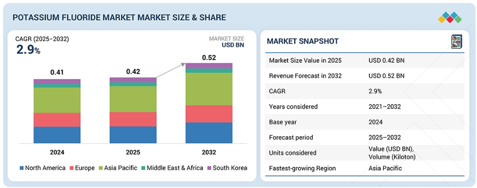 フッ化カリウム市場規模は、2025年の0.42億米ドルから2032年までに0.52億米ドルへ成長し、予測期間中に年平均成長率(CAGR)2.9%を記録すると見込まれております。