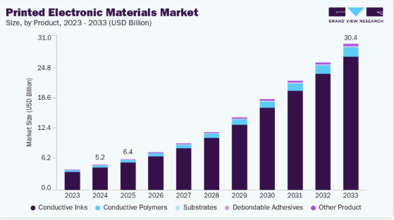 柔軟性と持続可能性を備えたエレクトロニクスへの需要は、既存の材料サプライヤーと新規参入企業の双方に、応力下での柔軟性・接着性・電気的特性を向上させる研究投資を促している。購入者は材料コストだけでなく、リサイクル可能性や環境影響を含むライフサイクル全体の価値を評価する傾向が強まっている。材料サプライヤー、印刷装置メーカー、エレクトロニクス統合企業間の連携も市場の信頼性を強化している。企業が生産拠点を拡大しサプライチェーンを最適化するにつれ、規模の経済が価格安定化をもたらし、コネクテッド包装、使い捨て医療センサー、自動車内装インターフェースなどの商業用途での普及促進が期待される。