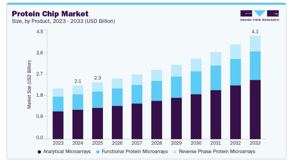 【英語タイトル】Protein Chip Market Size, Share & Trends Analysis Report By Product (Analytical Microarrays, Reverse Phase Protein Microarrays), By Application (Antibody Characterization, Clinical Diagnostics), By End-use, By Region, And Segment Forecasts, 2025 - 2033