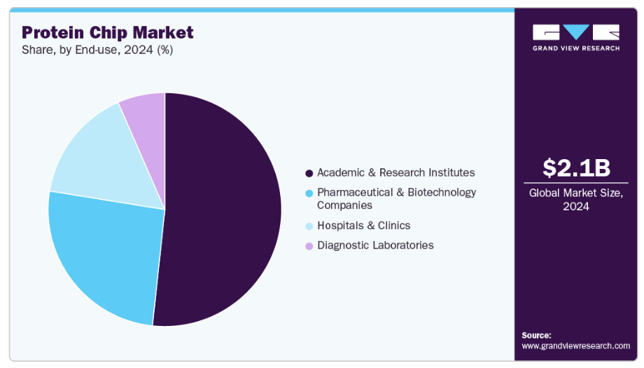 最終用途別では、2024年に学術・研究機関セグメントが51.71%の最大の収益シェアで市場をリードしました。学術・研究機関では、基礎科学、トランスレーショナルリサーチ、応用研究にまたがる様々な研究プロジェクトが実施されています。タンパク質チップ技術は、タンパク質間相互作用の研究、バイオマーカー発見、薬剤スクリーニング、疾患メカニズム解明において研究者に強力なツールを提供します。例えば2024年2月、アストン大学とウォリック大学の研究者グループは、持続可能な製造を支援し創薬を促進する膜タンパク質の開発に向け、197万米ドルの助成金を獲得しました。このためタンパク質チップは、学術・研究機関が目標達成のために広く活用されています。