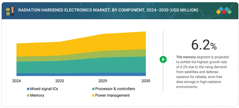 政府および商業衛星の開発増加、ならびに高軌道長期衛星を含む複数の宇宙ミッションの拡大は、耐放射線性電子市場に成長機会をもたらしています。しかしながら、耐放射線性電子の主要な市場推進要因は、偵察軌道衛星や通信衛星などの低軌道アプリケーションであり、これらはミッションの信頼性確保のために高度な耐放射線性ICを採用しています。