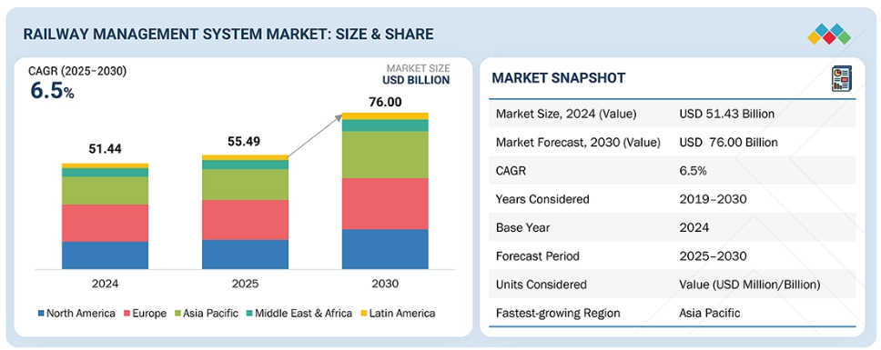 鉄道管理システム市場は、2025年の554億9,320万米ドルから、2030年までに760億130万米ドルに達すると予測されており、年平均成長率(CAGR)は6.5%と見込まれております。