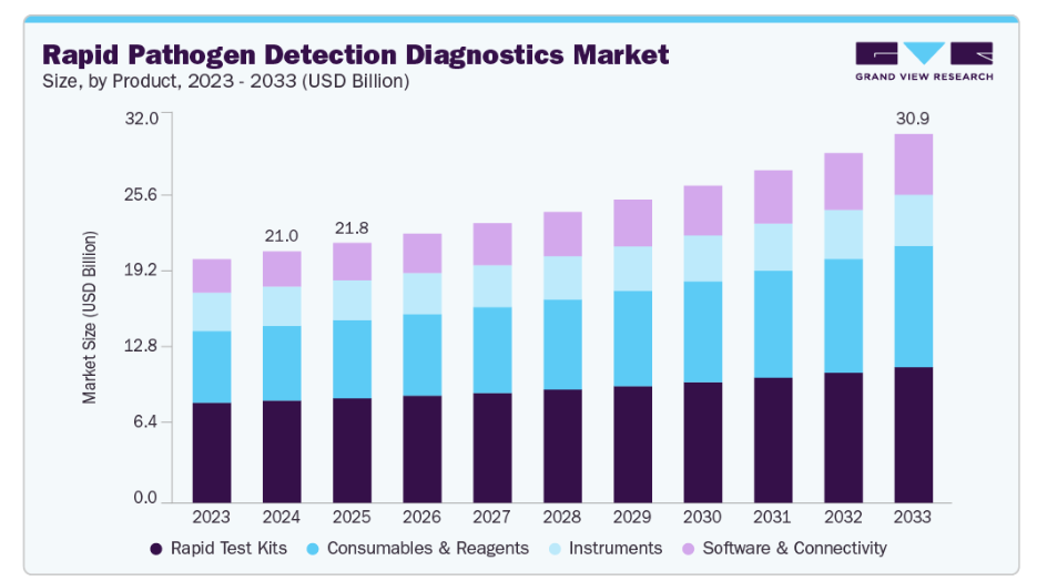 さらに、細菌性疾患の制御と予防を目的とした政府プログラム、公衆衛生イニシアチブ、資金調達活動の増加が、迅速病原体検出診断市場の成長を促進しています。国内外の機関は、アウトブレイクへの備えを強化するため、早期検出技術やポイントオブケア診断ツールへの投資を進めています。例えば2024年、WHOは画期的なグローバル保健イニシアチブの一環として、14カ国に120万個以上のコレラ迅速診断キットを配備したと発表しました。これは同種で最大規模の協調的取り組みであり、診断支援フレームワークとリアルタイム監視の初の公式実施を意味します。これにより早期検出能力が大幅に向上し、コレラワクチン接種キャンペーンの戦略的実行が可能となりました。このように、グローバルな調達・流通プログラムは、ガビ(Gavi)、WHO、ユニセフ(UNICEF)、FINDをはじめ、グローバルな保健安全保障の強化に取り組むパートナー機関間の協力の成果です。