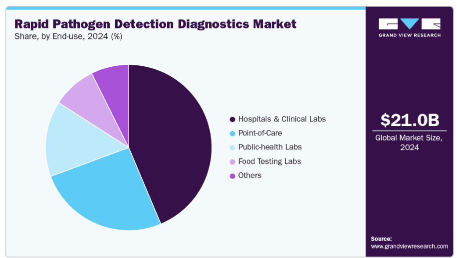 さらに、公衆衛生監視・アウトブレイク対応分野は、感染症監視インフラへの投資増加と感染症発生の早期発見・管理ニーズの高まりを背景に、予測期間において迅速病原体検出診断市場で最も急速に成長するセグメントです。迅速なポイントオブケア診断技術の普及拡大が、政府主導の取り組みやグローバルヘルスプログラムと相まって、さらなる成長を促進しました。リアルタイムのデータ収集・分析により、世界中の病院、地域医療センター、現地検査拠点において、迅速な意思決定、疫病対応の改善、準備態勢の強化が実現しました。