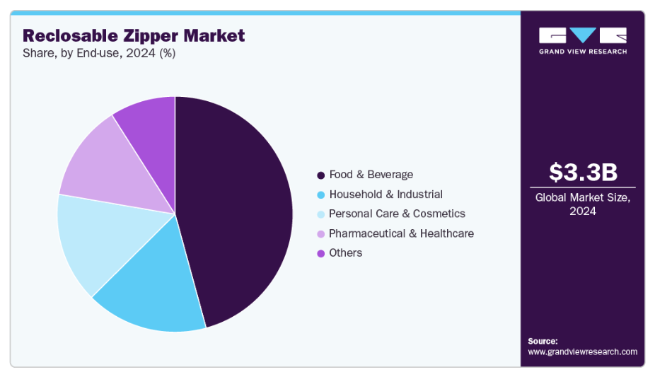 食品・飲料セグメントは2024年に45.0%超の最大市場シェアを記録し、予測期間中は6.5%という最も高いCAGRで成長すると見込まれています。再封可能ジッパーは、スナック、冷凍食品、乳製品、ベーカリー製品、飲料向けのパウチ、袋、スタンドアップパックなどのフレキシブル包装形態に広く採用されています。製品の保存期間延長、鮮度保持、分量管理機能により、現代の食品包装における基本機能として定着しています。