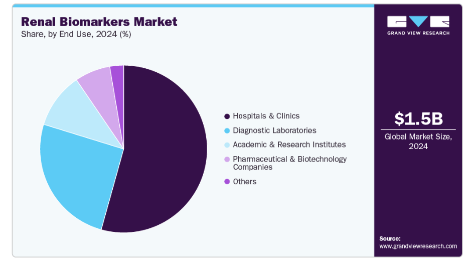 製薬・バイオテクノロジー企業セグメントは、予測期間において最も高い成長率が見込まれております。これは、標的治療薬の開発を支援するため、製薬・バイオテクノロジー企業が腎臓バイオマーカー研究への投資を拡大していることが背景にあります。バーテックス・ファーマシューティカルズによるアルパイン・イミューン・サイエンシズの49億米ドルでの買収は、腎臓疾患ポートフォリオの拡充に向けた産業の取り組みを裏付けるものでございます。この戦略的動きは、企業が腎臓関連疾患の革新的治療法に注力する広範な傾向を反映しております。