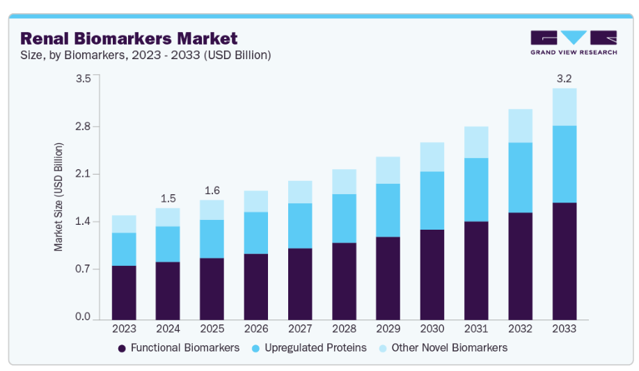 ブエノスアイレスで開催された2024年ISN世界腎臓学会(WCN’24)で発表されたこの知見は、CKDがもたらす世界的な健康課題の深刻化を浮き彫りにするとともに、その重大な経済的・環境的影響を強調しました。腎臓病患者の基盤が拡大し続ける中、より高感度・高特異性かつ多重測定が可能なバイオマーカー検査への需要は継続的に増加しています。さらに、糖尿病や高血圧といった併存疾患、高齢化人口の増加が腎臓への負担をさらに悪化させており、臨床医や保険者(ペイヤー)は、予後予測・治療の層別化・経過観察の精度向上のため、疾患進行の早期段階から高度なバイオマーカー(例:NGAL、KIM-1、シスタチンC)の導入を迫られています。未診断の早期CKDの割合が高いこと(機能低下が生じるまで90%もの症例が気づかれない場合もある)は、従来の指標(eGFR、クレアチニン)が著しく逸脱する前に、早期の損傷を確実に警告するツールの潜在的な市場可能性を浮き彫りにしています。