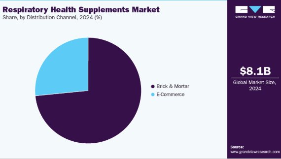 ビタミン・ミネラルセグメントは、予防医療への広範な採用と微量栄養素欠乏に対する消費者意識の高まりにより、2024年に36.50%の収益シェアで市場を支配した。これらのサプリメントは免疫力、肺機能、総合的な健康維持をサポートする効果で認知され、幅広い年齢層から高い支持を得ている。強力なブランド力、広範な流通網、錠剤・カプセル・粉末など利便性の高い形態での提供が市場リーダーシップをさらに強化した。継続的な製品革新と高まる健康意識が、予測期間中も同セグメントの優位性を維持すると見込まれる。