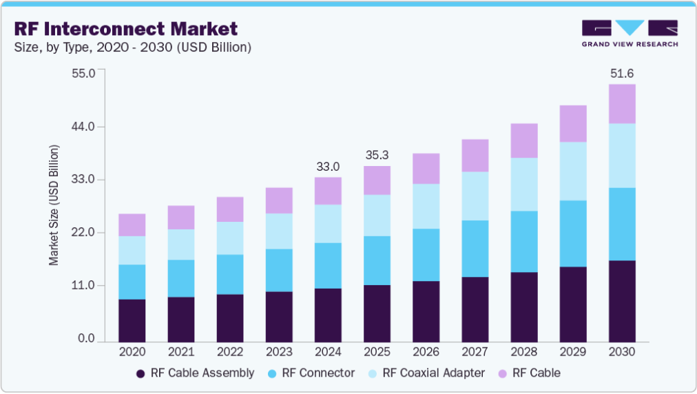 【英語タイトル】RF Interconnect Market (2025 - 2030)Size, Share & Trends Analysis Report By Type (RF Cable, RF Cable Assembly), By Frequency (Upto 6GHz, Upto 50GHz, Above 50GHz), By End Use (Aerospace & Defense, Medical), By Region, And Segment Forecasts