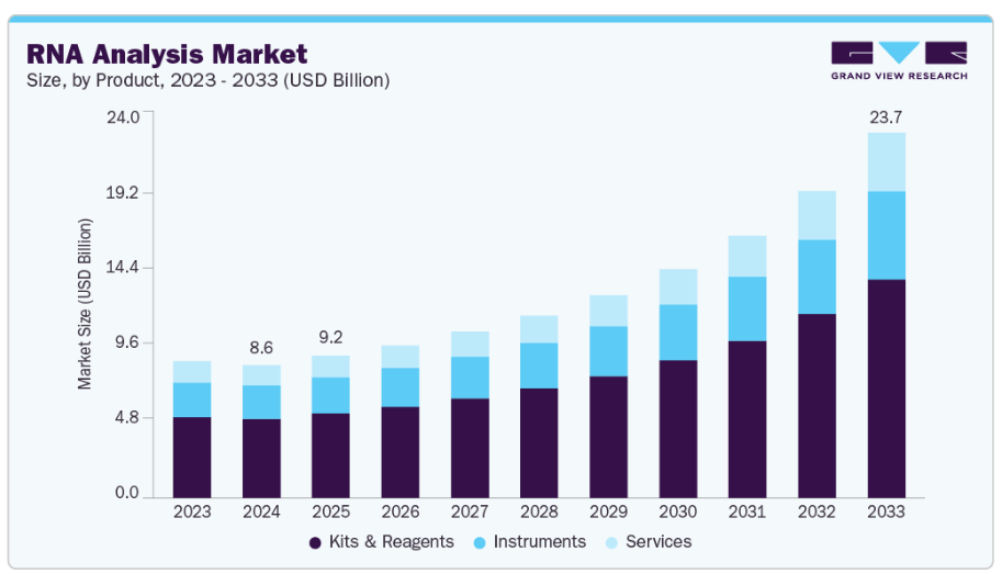 mRNAワクチンやRNAi治療薬を含むRNA治療薬の需要が高まっています。過去のウイルスパンデミックにおけるmRNAワクチンの商業的成功は、RNAプラットフォームが民間企業や政府機関からより大きな関心を集める道を開きました。ハイスループットRNAシーケンシングは、最先端のバイオインフォマティクスツールと組み合わせて、ワクチン開発の加速、免疫応答のモニタリング、潜在的な安全性の懸念事項の特定にますます活用されています。したがって、RNA解析に取り組む製薬会社やバイオテクノロジー企業は、その能力を向上させ、継続的な成長を促進しながら、世界のRNA解析市場における長期的な機会を創出しています。
