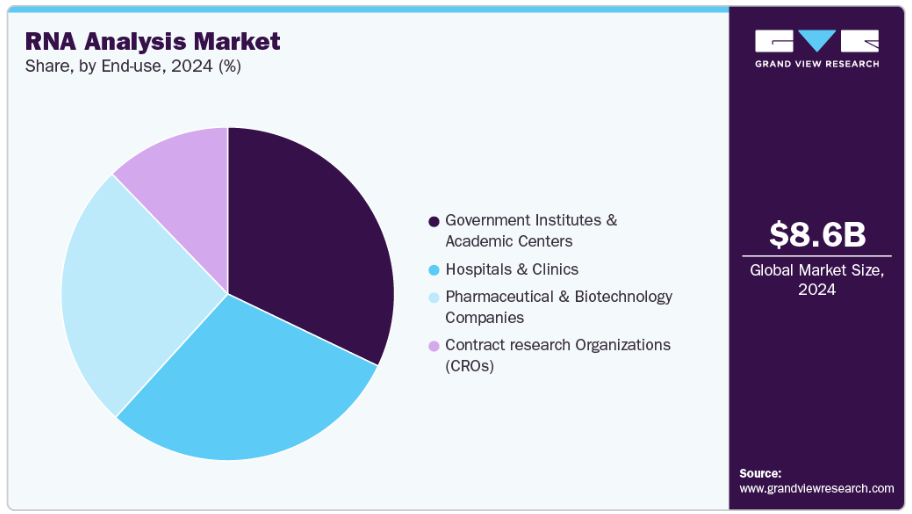 サービスセグメントは、2025年から2033年にかけて最も高いCAGRで成長すると予測されています。製薬分野における研究開発活動の拡大と、ライフサイエンス研究への政府投資の増加が、RNA解析サービスの需要を押し上げると予想されます。ユーロフィン・サイエンティフィック、ジェニウィズ、QIAGENなどの複数の企業が、mRNAシーケンシング、トランスクリプトームプロファイリング、RNAサンプル調製・ライブラリ構築・シーケンシング・データ解析といったエンドツーエンドソリューションを含む、様々なRNA解析サービスを提供しています。多様なサービスの提供が、今後数年間で市場を活性化させると見込まれます。