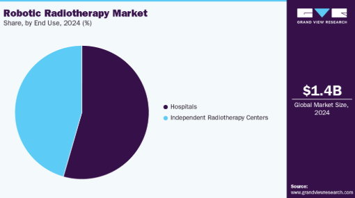 アプリケーション別では、肺がんセグメントが市場を牽引し、2024年に最大の収益シェアを占めた。肺がんは、腫瘍の動きの複雑さと健康な肺組織を温存する必要性から、ロボット放射線治療において最も頻度が高く困難な適応症の一つであり続けている。2025年2月に発表されたWHOの記事によると、2022年には世界で約250万人が肺がんと診断され、これは年齢調整率(ASR)で10万人あたり23.6症例に相当する。肺がんの世界的な高い負担は、ロボット支援および画像誘導放射線治療システムの導入を促進している。これらのシステムは、正確な腫瘍追跡、運動管理、適応線量投与を可能にし、局所制御を改善すると同時に周囲の正常組織への毒性を最小限に抑える。