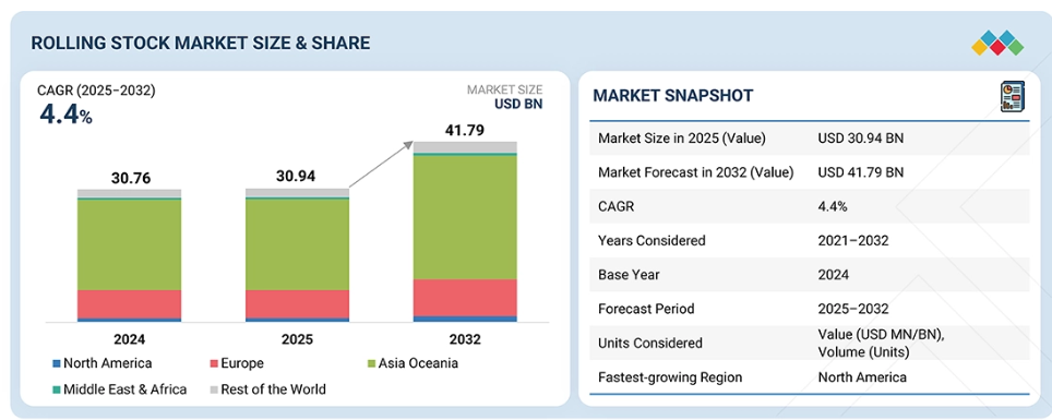 鉄道車両市場は、2025年の309億4,000万米ドルから2032年までに417億9,000万米ドルへ、年平均成長率(CAGR)4.4%で成長すると予測されています。鉄道事業者や政府が気候変動対策への取り組み、燃料費高騰、運行信頼性のバランスを図る中、電気ディーゼル方式と完全電化方式の採用が進んでいます。