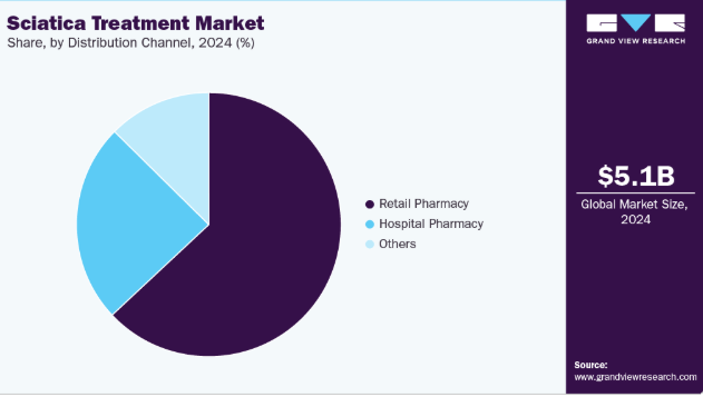 小売薬局セグメントは、広範なアクセス可能性、患者による市販薬の選好、処方箋不要での入手利便性などの要因により、2024年に63.00%という最大の収益シェアを占めた。小売薬局では、坐骨神経痛の第一選択治療として一般的に使用される非ステロイド性抗炎症薬(NSAIDs)、外用鎮痛剤、筋弛緩剤など、多様な坐骨神経痛治療薬を提供している。小売環境でのこれらの薬剤への容易なアクセスが、即効性を求める患者層における人気を支えている。さらに、小売薬局チェーンの拡大と世界的な店舗数の増加は、坐骨神経痛治療薬の入手可能性をさらに促進し、市場における同セグメントの優位性を支えています。この傾向は、坐骨神経痛患者がアクセスしやすく非侵襲的な治療選択肢を継続的に好むことを反映しています。