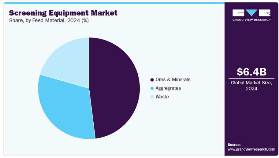 鉱石・鉱物セグメントは、鉱業における材料分類と粒度管理の継続的な需要に支えられ、2024年に48.0%という最大の収益シェアで市場をリードしました。選別システムは、製品の均一性を確保し、破砕や粉砕などの下流工程を最適化するために、鉱石の採掘・加工において不可欠です。世界的な金属需要の増加と継続的な探査活動が、さらなる設備導入を促進しています。