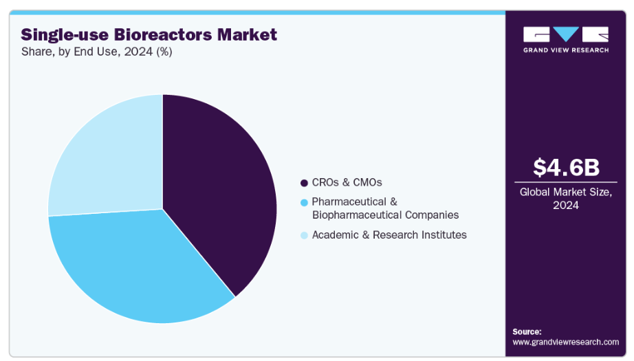 2024年時点で、CMO(受託製造機関)およびCRO(受託研究機関)セグメントは38.65%という大きなシェアを占めており、調査期間中最も急速に成長するセグメントとなる見込みです。CMOでは、供給生産能力の需要に加え、迅速なキャンペーン変更への対応がより求められます。その結果、より幅広い使い捨てコンポーネントやシステムが採用されています。アウトソーシングの増加傾向に伴い、CROおよびCMOはシングルユースバイオリアクターの採用をより積極的に進めています。