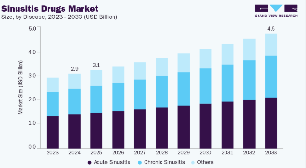 - 米国の副鼻腔炎治療薬業界は、2025年から2033年にかけて最高CAGRを記録すると予測される。