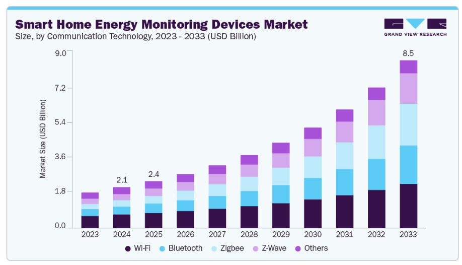 Zigbeeセグメントは、予測期間中に著しい成長が見込まれています。このセグメントには、スマートホームのエネルギー監視システムで頻繁に採用される低電力無線メッシュネットワークプロトコルであるZigbeeが含まれます。Zigbeeはデバイス間通信をサポートし、中央ルーターに依存することなく、複数の接続デバイス間で効率的なエネルギー管理を実現します。その低消費電力特性はバッテリー寿命を延長し、最小限のメンテナンスで長期稼働が求められるセンサーやメーターに適しています。Zigbeeのメッシュトポロジーは、デバイス間でのメッセージ中継を可能にすることでネットワークの信頼性と拡張性を高め、大規模な住宅や複雑な環境におけるカバレッジを向上させます。これらの特長は、特にエネルギー効率とデバイスの長寿命化が優先される環境での採用に貢献しています。