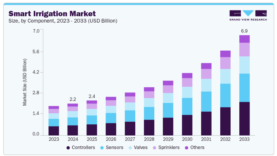 非農業分野は、2025年から2033年にかけて最も急速に成長するセグメントと見込まれています。都市部における効率的な造園・芝生管理の需要増加が、スマート灌漑産業の導入を促進しています。自治体、商業施設、教育機関、スポーツ施設は、緑地を維持しつつ水消費量を削減するため、高度な灌漑システムを求めています。これらの組織は、水コストの上昇や環境規制の強化に伴い、持続可能な手法の導入がますます求められています。スマート灌漑システムは、気象データ、土壌水分センサー、自動化技術を活用して水使用を最適化する解決策を提供し、特に水使用制限や干ばつに直面する都市部において高い需要が見込まれます。