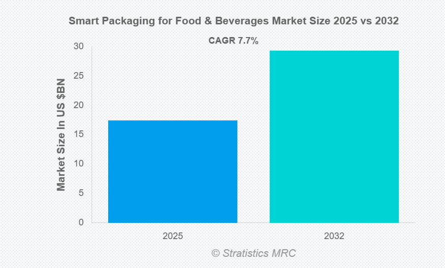 Stratistics MRCの調査によると、世界の食品・飲料向けスマート包装市場は2025年に174億4,000万ドル規模となり、予測期間中に年平均成長率(CAGR)7.7%で成長し、2032年までに293億2,000万ドルに達すると見込まれています。